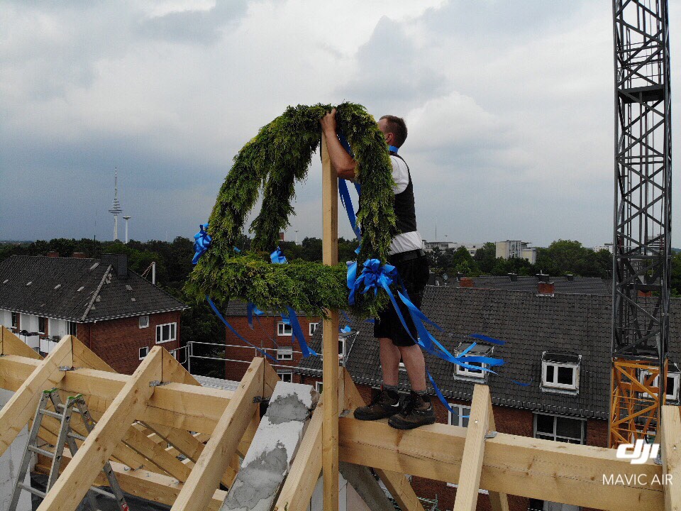 Wir freuen uns über den Dachstuhl in der Faulenstraße. Gestern, am 20. Juni war es soweit, Zimmerleute prosten auf unser Bauvorhaben und das Haus hat ein Dach. Wenn der Baufortschritt so weiter voran schreitet sind wir zum Jahreswechsel fertig.